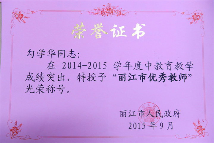 勾學(xué)華獲得的榮譽(yù)證書。(麗江融媒記者 趙慶祖 攝)