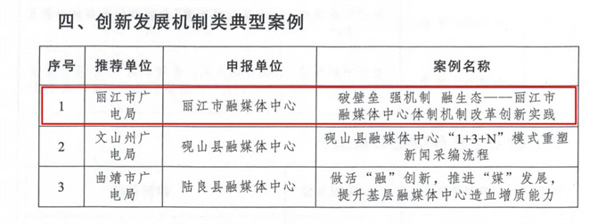 其中,由麗江市廣播電視局推薦的“破壁壘 強(qiáng)機(jī)制 融生態(tài)——麗江市融媒體中心體制機(jī)制改革創(chuàng)新實(shí)踐”案例,獲評(píng)2025年省級(jí)廣播電視媒體融合創(chuàng)新發(fā)展機(jī)制類(lèi)典型案例。