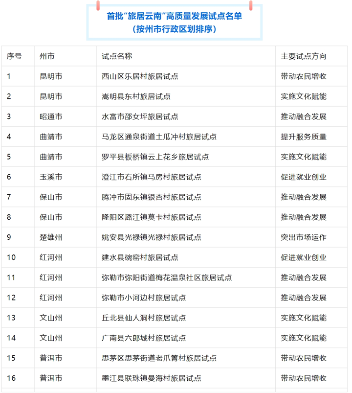 推介會(huì)還正式發(fā)布了首批26個(gè)“旅居云南”高質(zhì)量發(fā)展試點(diǎn)。這些試點(diǎn)覆蓋全省16個(gè)州市,聚焦帶動(dòng)農(nóng)民增收、促進(jìn)就業(yè)創(chuàng)業(yè)、推動(dòng)產(chǎn)業(yè)融合、實(shí)施文化賦能等九大方向,旨在通過(guò)典型引路,探索形成可復(fù)制、可推廣的旅居發(fā)展模式。