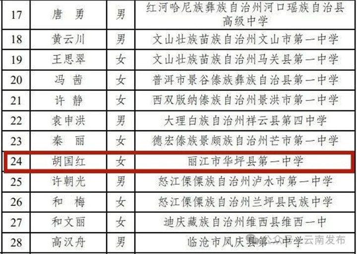 其中華坪縣第一中學(xué)教師胡國紅在列