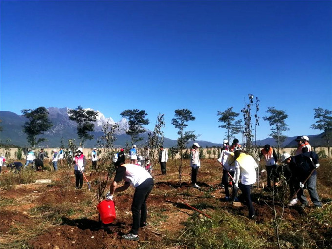 10月29日,玉龍雪山腳下的麗江植物園里人聲鼎沸,熱鬧軒然,來自上海賓三得利洋酒貿易公司的80多名員工和云南省楊善洲基金會領導及麗江市林草局技術人員,一起在植樹園里種下一棵棵蘋果、木梨樹,為雪山腳下再添一抹新綠。