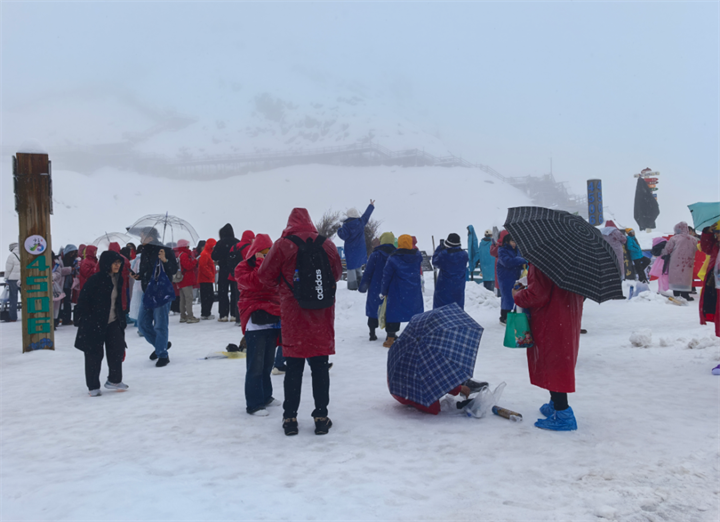 在海拔4506米的觀景臺上,來自五湖四海的游人們被眼前的美景徹底點(diǎn)燃了熱情。有的置身雪地盡情嬉戲,與純凈白雪親密相擁;有的攜精心準(zhǔn)備的道具,擺出多樣創(chuàng)意造型,用鏡頭定格雪山盛景;還有的組團(tuán)打起了雪仗,歡聲笑語縈繞山間,為靜謐的雪山增添了鮮活氣息。