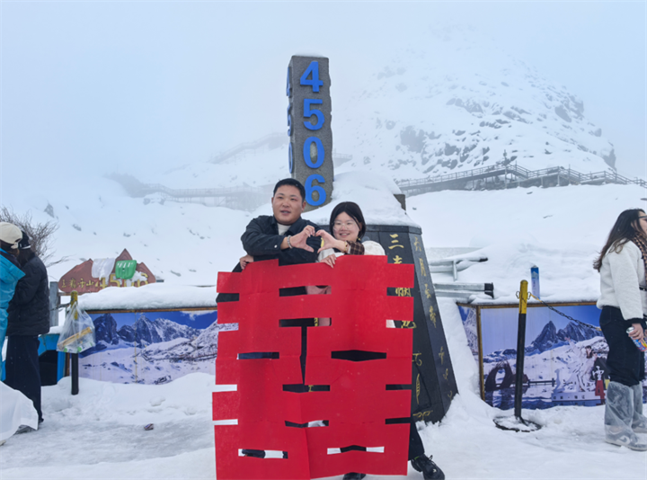 陜西游客權(quán)藝璇幸福地說:“我們剛完成婚禮便前來度蜜月,希望在雪山留下特殊紀(jì)念,特意攜帶‘喜’字拍攝,成片效果極佳?!?河北游客王士蘇也分享道:“聽聞玉龍雪山降雪,我們專程前來,恰逢降雪與放晴相間的好天氣,十分適宜拍照?!?/p>