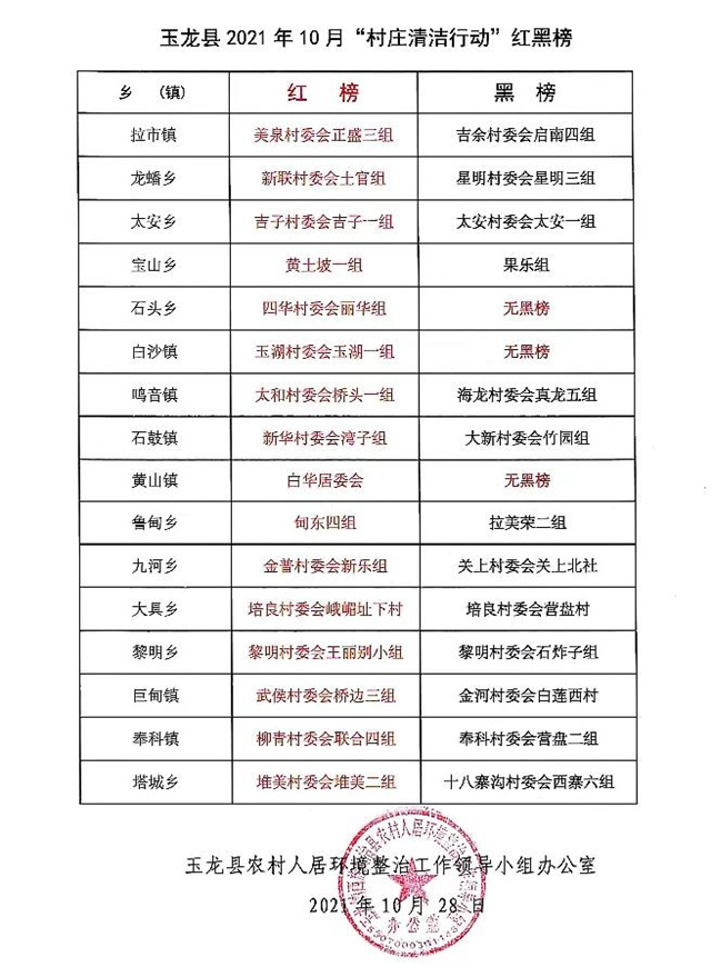 10月28日,玉龍縣農(nóng)村人居環(huán)境整治工作領(lǐng)導(dǎo)小組辦公室公布了10月玉龍縣村莊清潔行動(dòng)“紅黑榜”,要求: