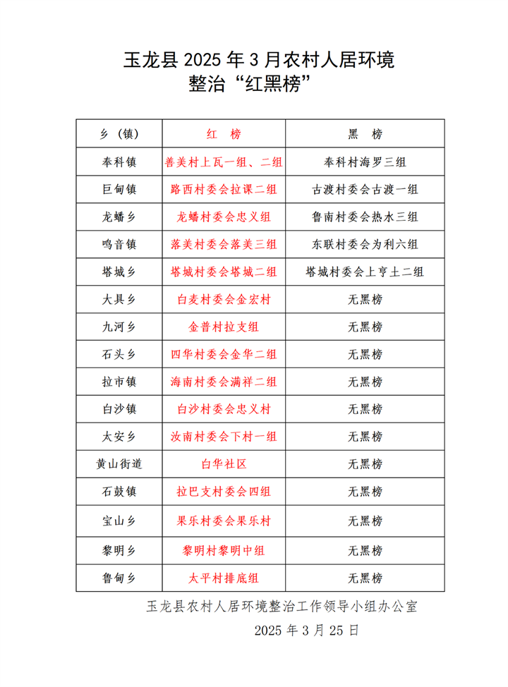玉龍縣2025年3月農(nóng)村人居環(huán)境整治“紅黑榜”