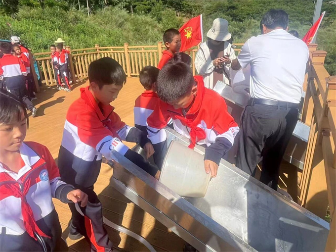 活動(dòng)當(dāng)天,30多名少先隊(duì)員在校外輔導(dǎo)員的指導(dǎo)下,將11191尾圓吻鲴倒入水槽,在水流的沖刷下,萬(wàn)余尾魚苗進(jìn)入程海游走,隊(duì)員們呵護(hù)著每一尾魚苗,直到它們游進(jìn)湖中??粗滩ㄊ幯暮?,少先隊(duì)員們臉上洋溢著歡快、幸福的笑容。