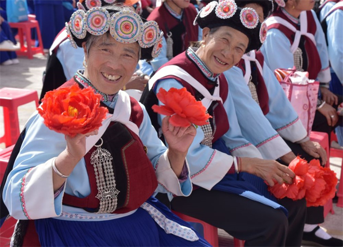 活動(dòng)現(xiàn)場(chǎng),老人們手拿表演用的花朵,臉上綻放著幸福的笑容。(麗江融媒記者 段玉菊 攝)